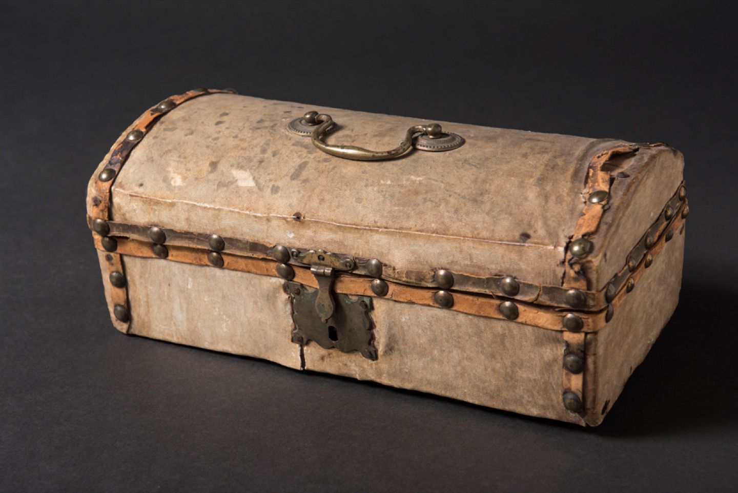 The Ursuline Convent Academy, opened in 1820, was the first Catholic girls’ school in Massachusetts, and was burned down by anti-Catholics in 1834. Elizabeth Williams Hayward, a former student, compiled a collection of papers about the fire; the documents were originally stored in this vellum-covered trunk.