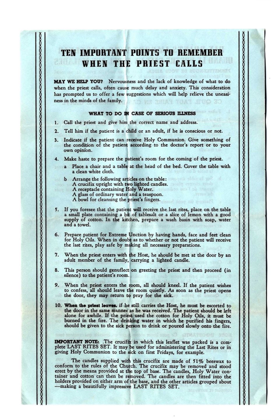 The Liturgy and Life Collection—materials that document the liturgical movement in the American Catholic Church from 1925 to the mid 1960s—includes religious artifacts in a myriad of forms. These objects are at the intersection of the sacred and the professional as they work with clergy to perform prescribed holy functions. They also emphasize the practical uses these objects were put to, from directing family members preparing for a sick call from a priest, to fluting the brim of a nun’s wimple. For many devoted Catholic individuals, these materials also served as physical connections to their Catholic faith.