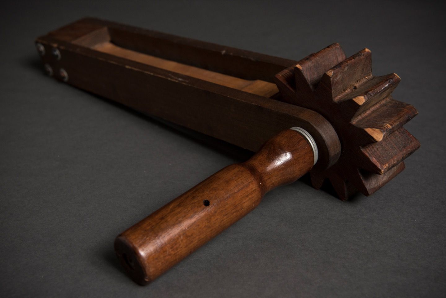 Sick call sets, often kept by lay people, are used by priests performing the sacrament of anointing the sick. In addition to the tools the priest needs, this particular set includes directions for how a family member should prepare for the priest’s visit. This clapper’s unassuming appearance belies the racket it can make when spun. Clappers like these were typically used during Holy Week in place of bells during the service.