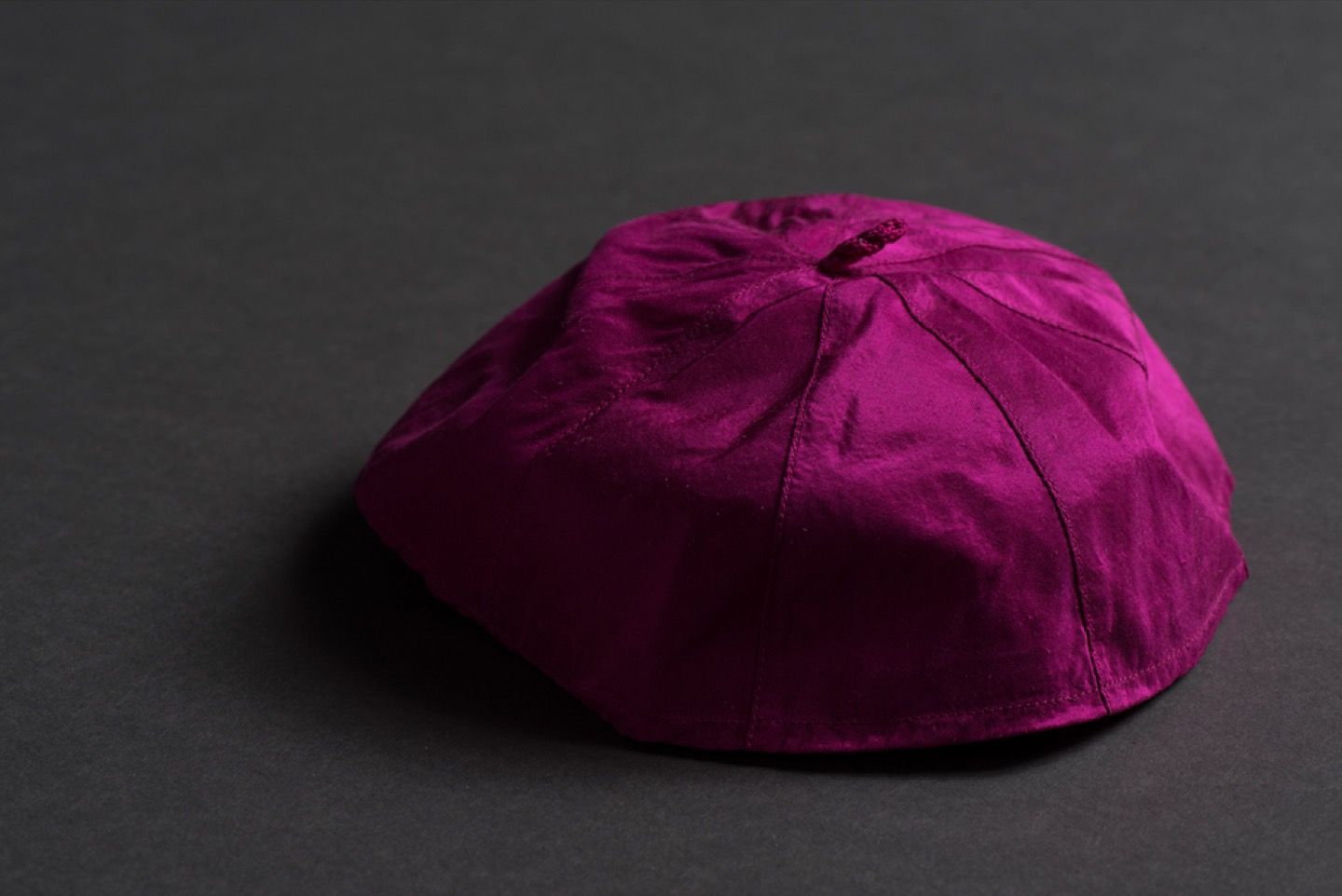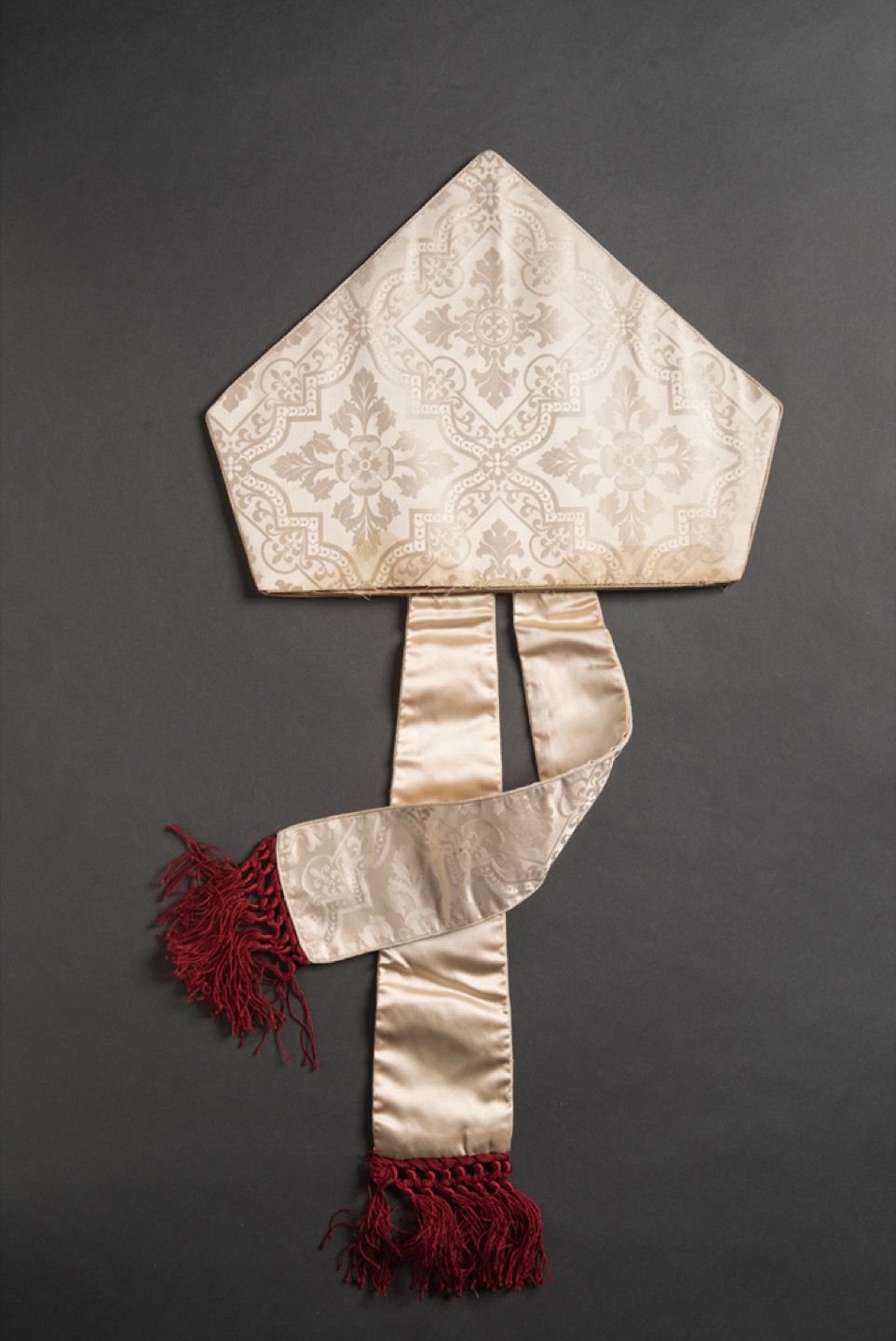 Liturgical vestments worn by clergy are meant to both glorify God and denote the office of the person wearing them. The skullcap, or zucchetto, is worn beneath the biretta, and is lined with leather to help it retain its shape. This pre-Vatican II chasuble has more elaborate embroidery on the back, most visible when the priest celebrated Mass while facing the altar. The sweat stains on the edge of this particular mitre are an obvious and humanizing connection to the bishop who once wore it.