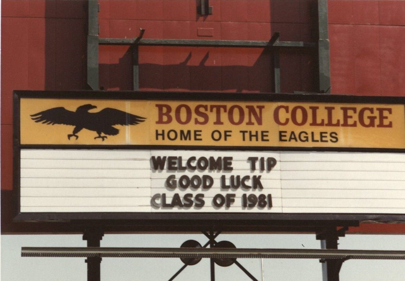 Despite O’Neill’s many contributions both to Boston College and the nation as a whole, his achievements are in danger of fading from popular memory. For instance, today’s undergraduates were not yet born when he retired from political life in 1986. Years after his graduation from Boston College, O’Neill remained fond of his alma mater and his alma mater celebrated his achievements. This sentiment is evident in the photograph reproduced here. The image shows a sign at Alumni Stadium welcoming O’Neill to the campus for the 1981 Commencement.