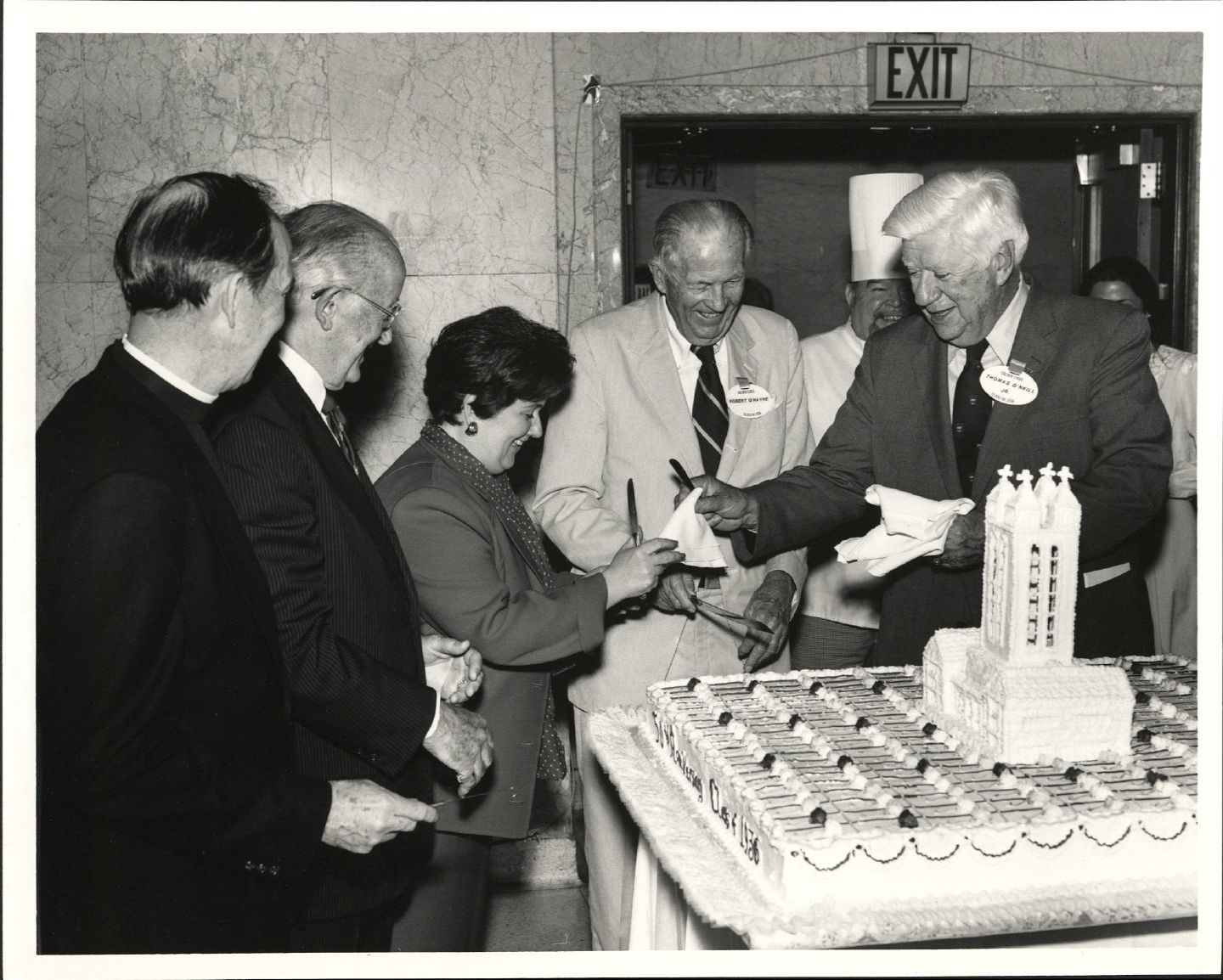 In May 1986, Thomas O’Neill returned to Boston College to take part in the Class of 1936’s Fiftieth Anniversary. In the photograph on the left, O’Neill is seen joyfully taking in the reunion festivities along with Father Monan, an unidentified alum, Alumni Association President Sheila McGovern, and classmate Robert O’Hayre. In 1987, O’Neill honored his alma mater even further by donating his congressional papers to Boston College’s John J. Burns Library of Rare Books and Special Collections.