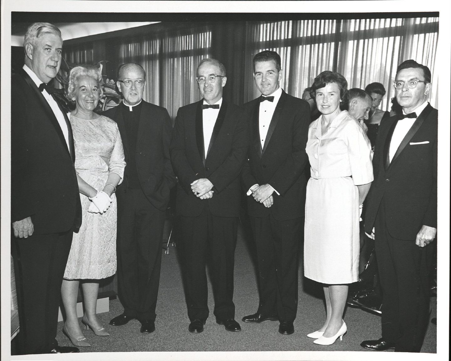 O’Neill took part in Boston College’s Centennial Celebrations in 1963. The highlight of the proceedings was President John F. Kennedy’s address to the Centennial Convocation on April 20, 1963. Besides being an important historical milestone for the school, it also spearheaded a major development campaign. O’Neill is pictured with his wife, Fr. Donovan, Mr. and Mrs. John T. Driscoll, and Edward Boland at the Centennial banquet, June 2nd, 1963.