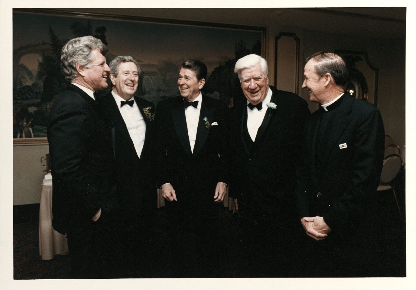 Later that day, 2300 people attended a $1000-per-plate gala reception in honor of O’Neill’s 50 years of public service hosted by Boston College at the Washington Hilton. O’Neill was given tributes by J. Donald Monan, S.J., Senator Ted Kennedy, Irish Prime Minister Garret FitzGerald, Comedian Bob Hope, former President Gerald Ford and President Ronald Reagan. Monan remarked that “Speaker O’Neill could have authorized a salute to his years in a dozen ways without any involvement of Boston College. The fact that he wanted much of the splendor of his own career to reflect upon his Alma Mater is characteristic of him, and gives a clue to why people so enjoyed celebrating his career.” The event raised two million dollars for the Thomas P. O’Neill, Jr. Scholarship Fund. The scholarship is designed to aid less advantaged youths in the Boston area who without financial assistance could not otherwise attend Boston College.