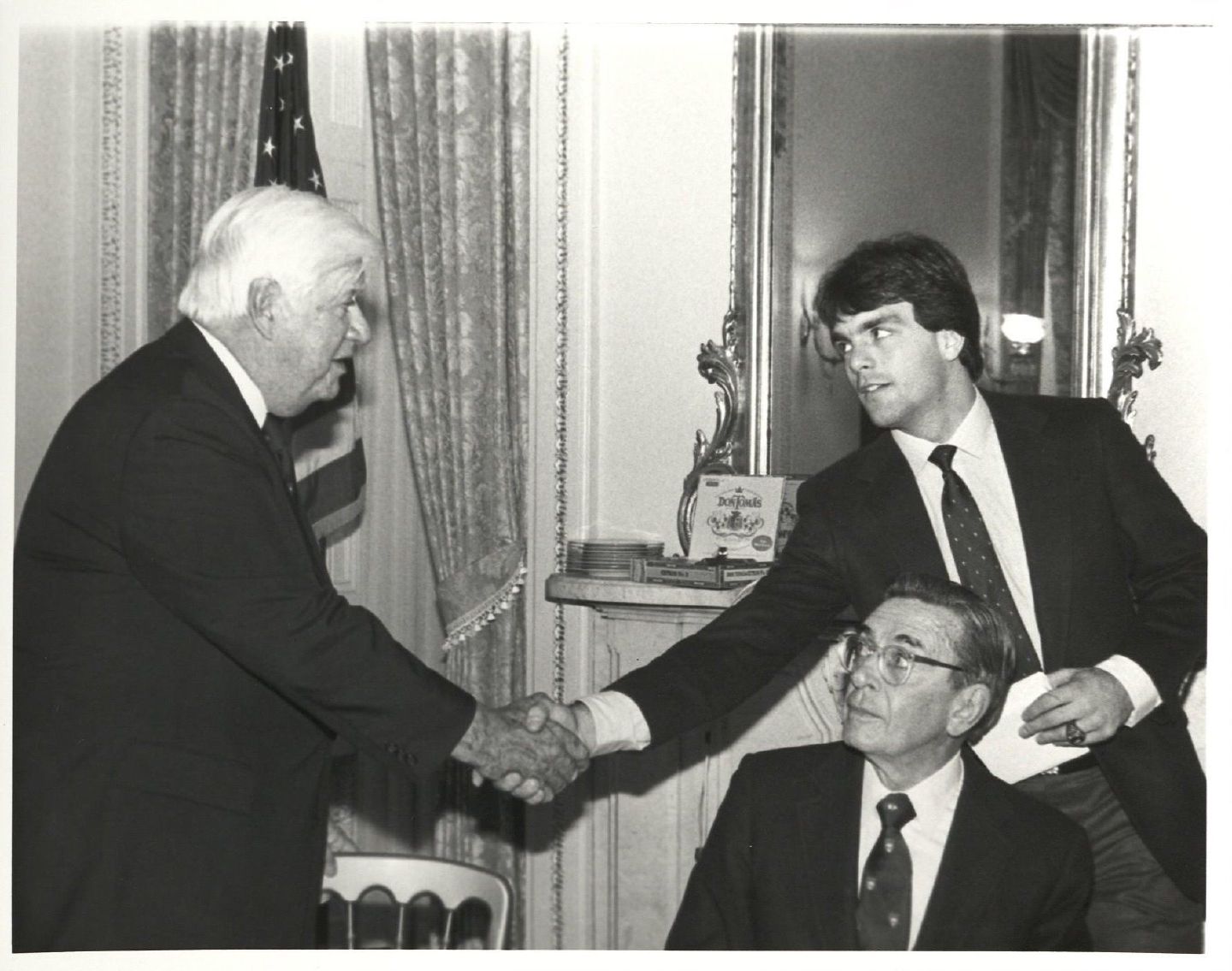 Like many other alumni, Thomas O’Neill had a lifetime passion for Boston College athletics. As an alum, he often attended hockey and football games. O’Neill is shown here shaking Doug Flutie’s hand (Edward Boland is seated). Flutie (Class of 1985) had just won the Heisman Trophy and the photograph was taken at a luncheon in his honor. Boston College athletics had a way of affecting all aspects of O’Neill’s life. Biographer John Farrell notes that is was during a hockey game that Mildred Miller pressed O’Neill for a long term commitment and they decided to get to married