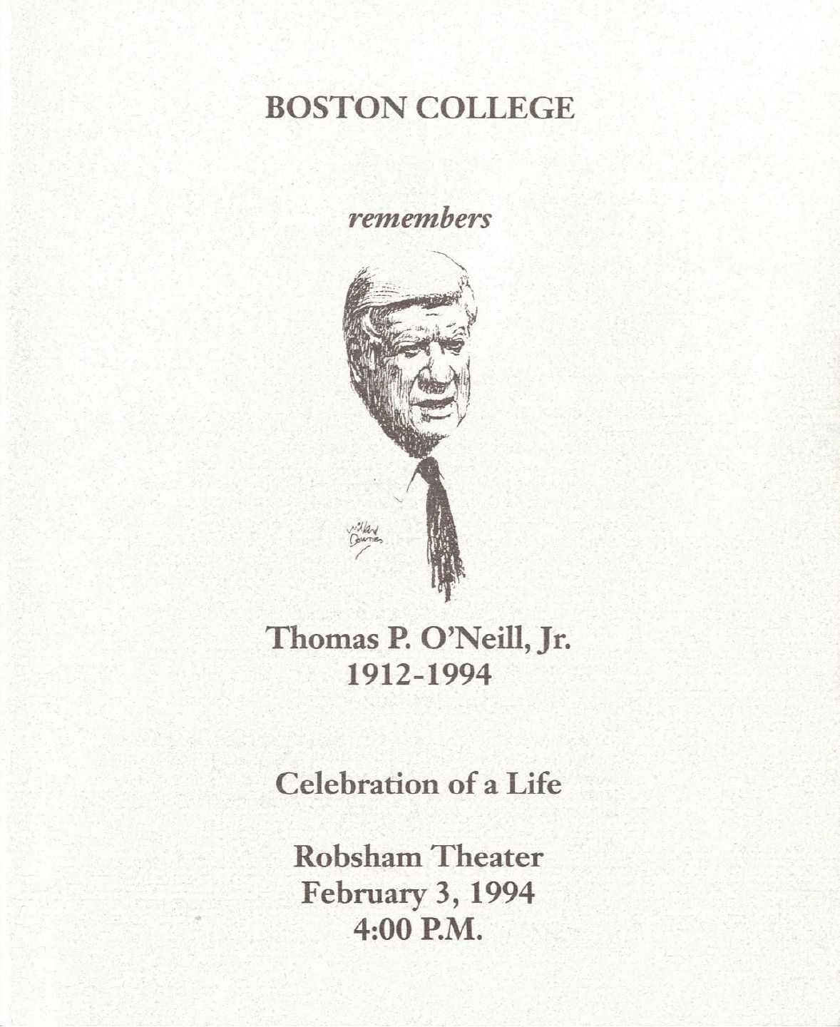 On January 5, 1994, Thomas P. O’Neill, Jr. passed away at Brigham and Women’s Hospital in Boston. He was eighty-one years old. It was a sad day for Boston College as it had lost one of its “favorite sons.” On February 3, the Boston College community held a final tribute for O’Neill. The cover of the program is reproduced to the left. Charles D. Ferris (Class of 1954), former General Counsel to the Speaker, remarked “He [O’Neill] never insulated himself from the pain of normal people. In his 50 years of public service, he never forgot who he was, where he came from, or who hired him…I never saw him look over the shoulder of a person to try and talk to someone else who may have been more important…Duplicity was a stranger to him. I think Tip must have failed Latin here at Boston College; he didn’t know the meaning of pro forma.” Though Boston College was not in his home district, O’Neill always represented the university well.