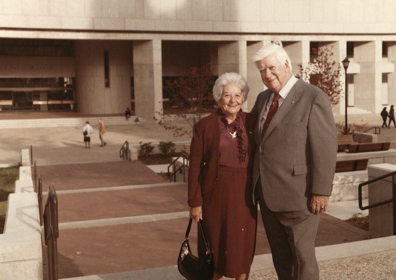On January 6, 1994, President J. Donald Monan, S.J. issued a public statement and remarked that “For the past 50 years, it has been this University’s pride to witness the love and esteem of the entire nation spontaneously directed to one of its beloved sons. If it has always been Jesuit education’s aspiration to educate men and women for service to others, Speaker O’Neill is one whose faith helped him understand the importance of taking responsibility for his world and making a difference for others; but it bestowed the humility as well to know that even largeheartedness is a gift to enhance not himself but those he loved and served.” It is indeed a fitting legacy that the name of Thomas P. O’Neill Jr. lives on in so many ways at Boston College to this day. O’Neill is pictured here in a 1984 photograph standing with wife Millie in front of the library named in his honor.