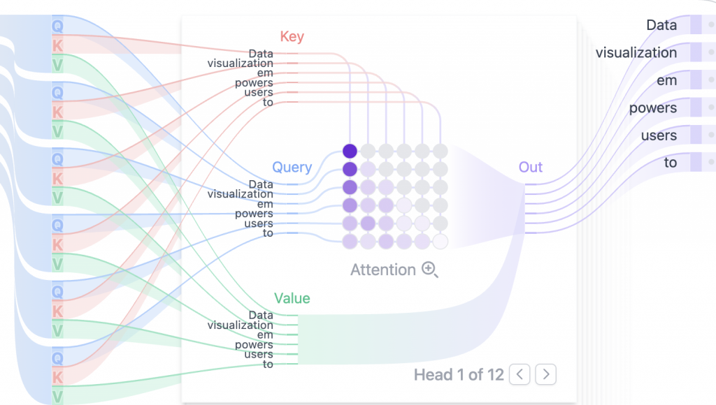 The “T” in GPT: Generative Pre-trained Transformer. Transformers were the breakthrough technology that turned neural networks from a curiosity to the chat tool that OpenAI released in the fall of 2022. A very brief description: multiple layers of interacting neural networks simultaneously work on predicting the most probable next character-strings in a sentence, and to construct sentences and paragraphs that resemble human-created text. It’s much easier to interactively visualize this activity than to describe it.